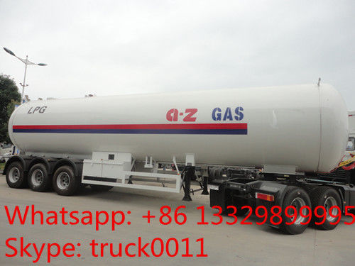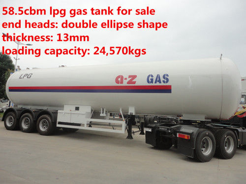 58.5cbm LPG tanker semitrailer for LPG GAS adopts 13ton FUWA triple axles, 12 sets 12.00-20 vacuum tyre, and another spare tyre, JOST 28ton outrigger, JOST traction pin, fire extinguisher bottle, anti-static tape.